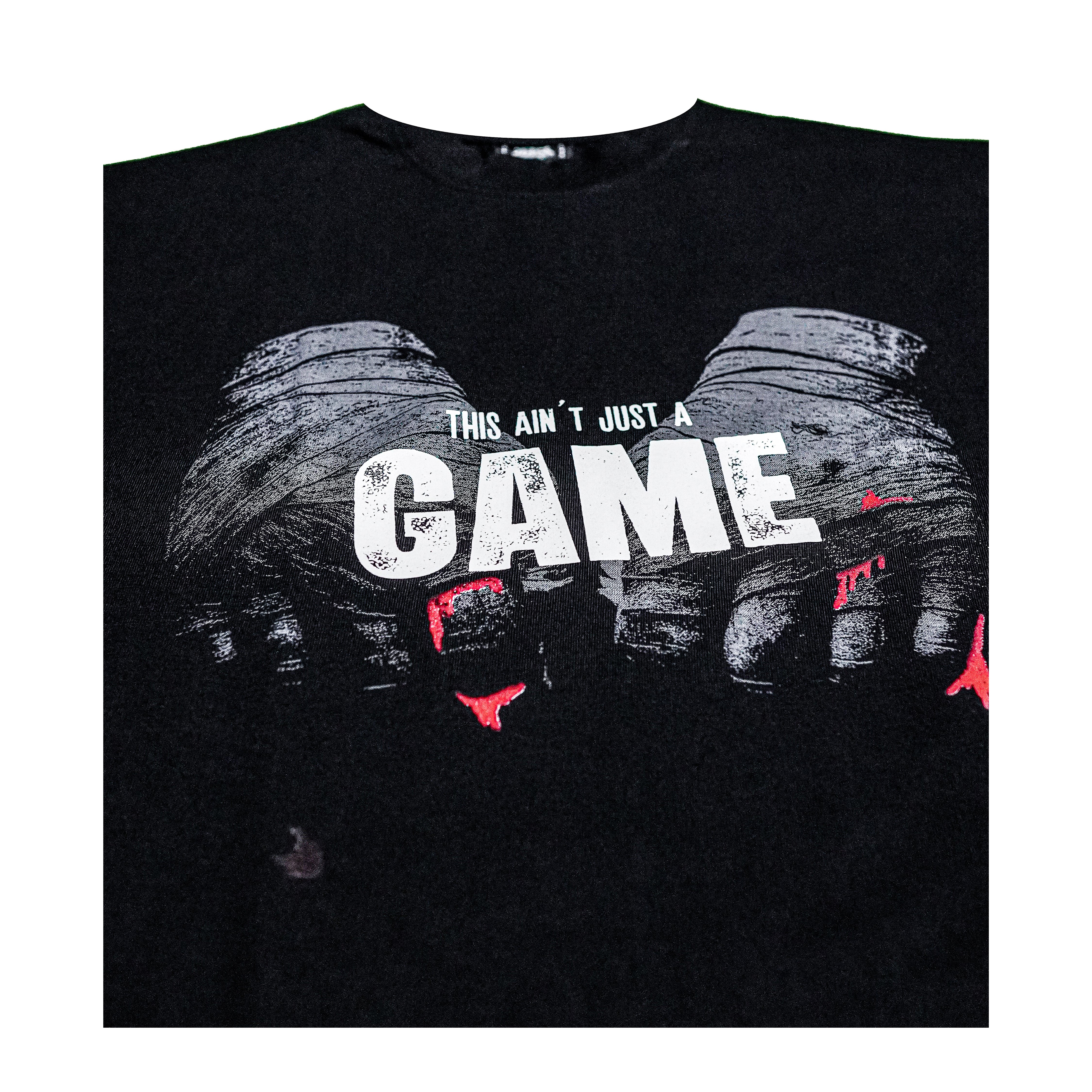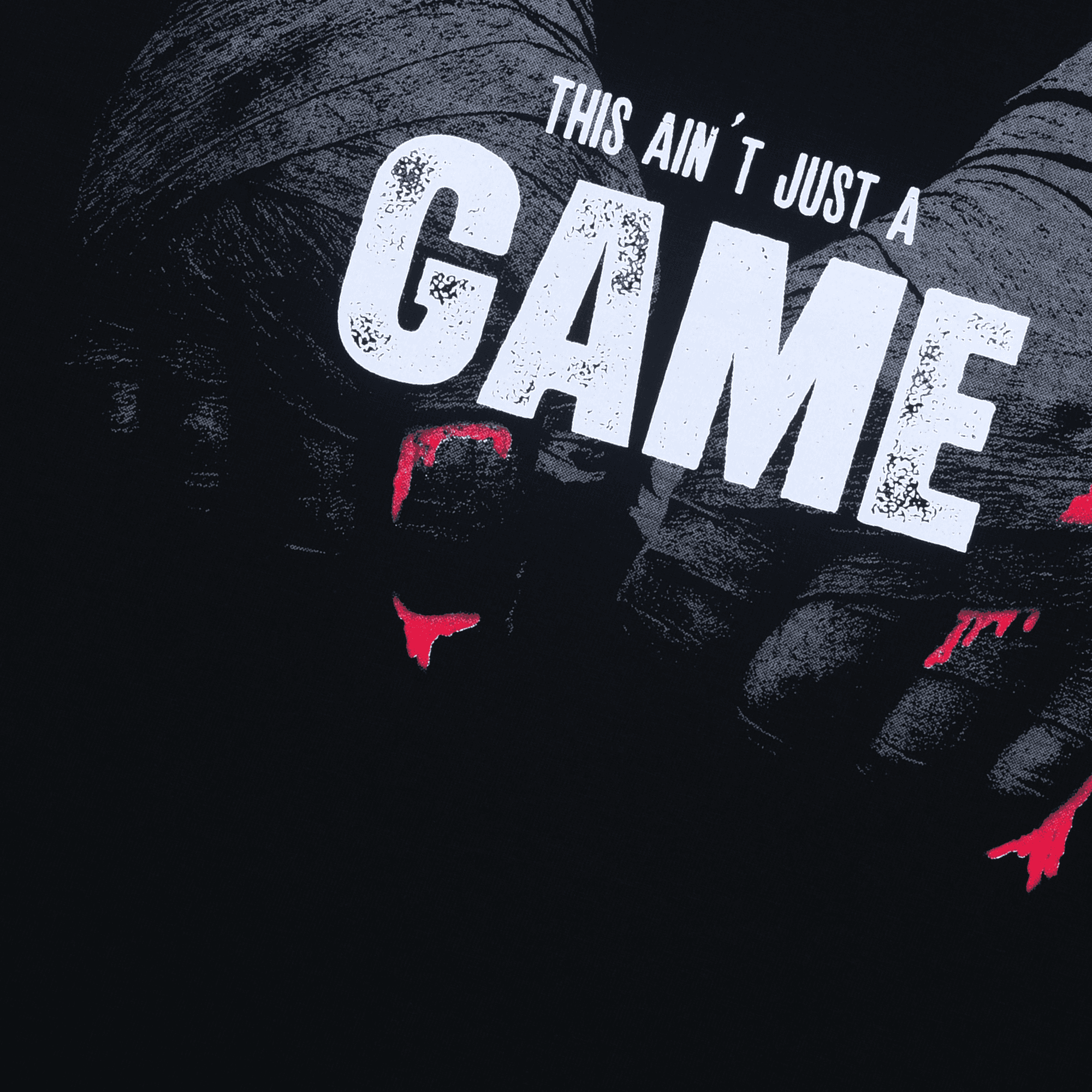 At the centre of the artwork, two clenched fists wrapped in tape symbolise determination and sacrifice. Above them, the phrase “This Ain’t Just a Game” highlights the harsh reality of MMA as survival, not play. The distressed typography and splashes of blood-red emphasise the pain, sweat, and sacrifice involved. Set against a dark background, the fists and text confront the viewer, demanding respect for the fight. This artwork declares that, for warriors, the cage is not a game—it’s life itself.